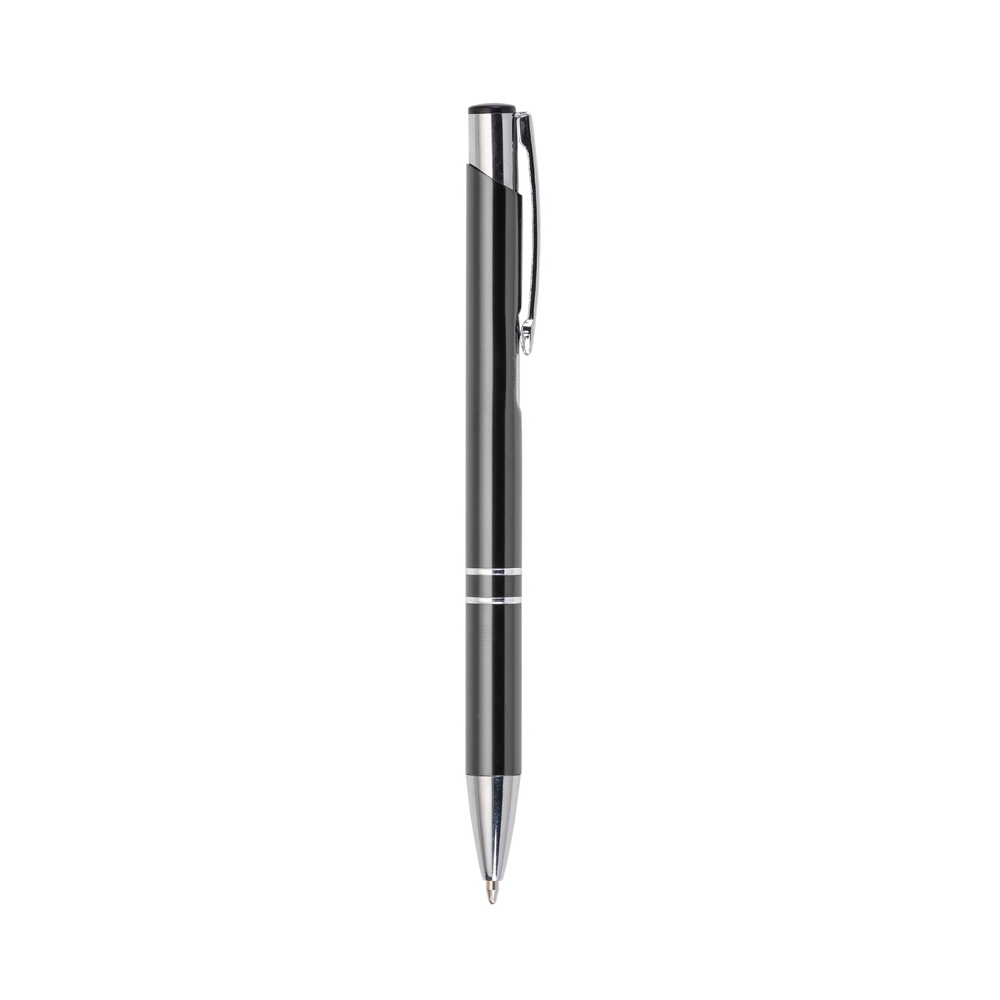 Caneta metálica com carga esferográfica azul e acionamento por clique.