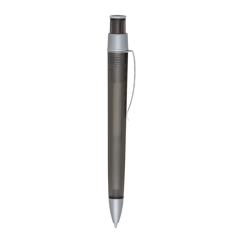 Caneta plástica com clip metálico vazado, carga esferográfica azul e acionamento por clique. OBS.: PEDIDOS MÍNIMO DE 50 PEÇAS!