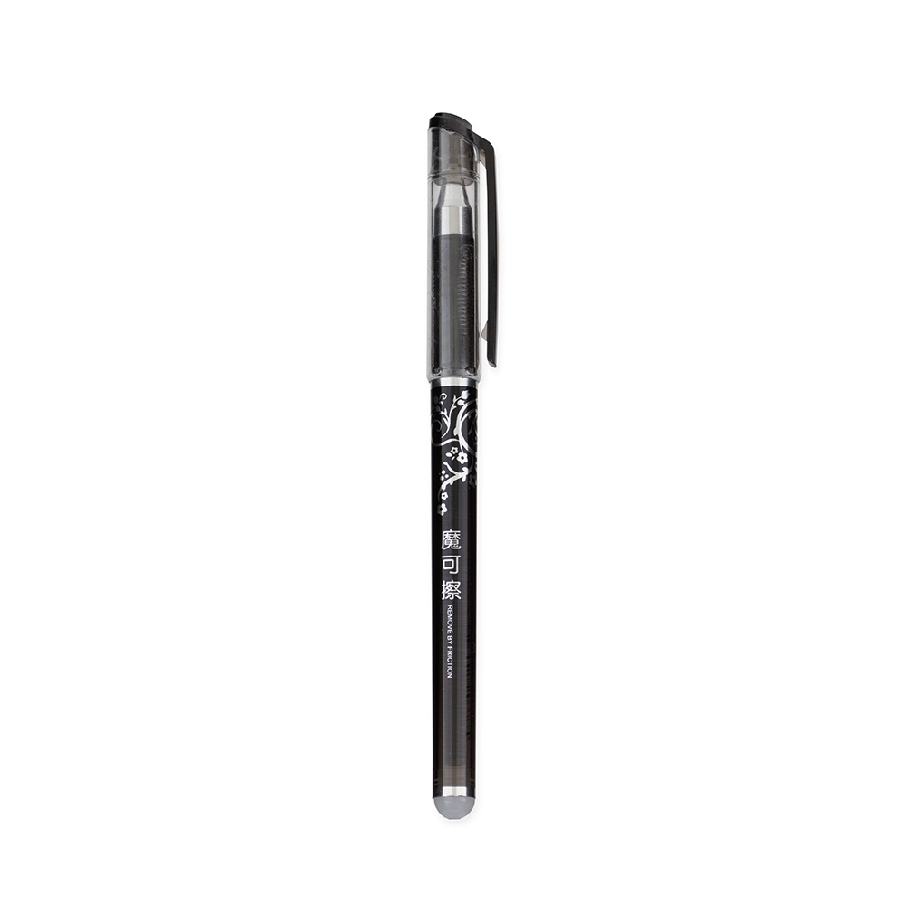 Caneta plástica com tampa. Possui carga em gel de 0.5mm apagável a partir do uso da borracha térmica fixa à ponteira.