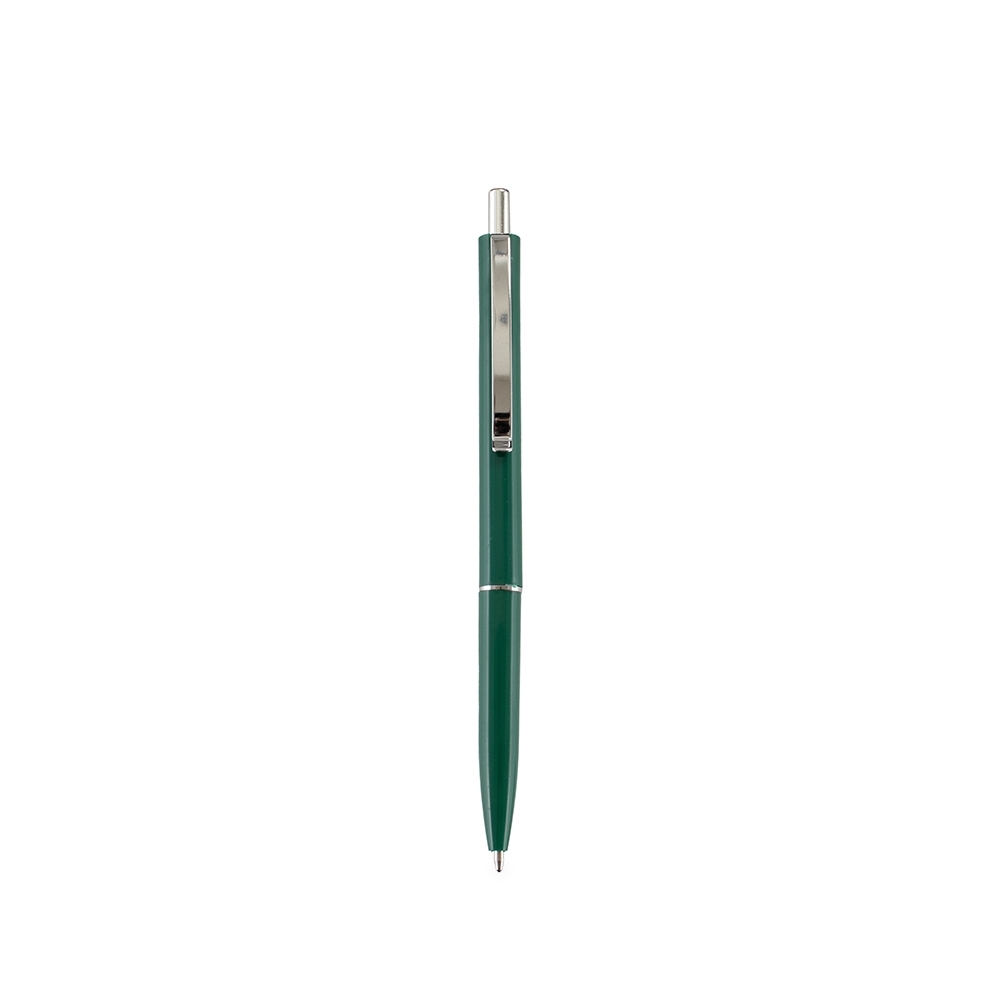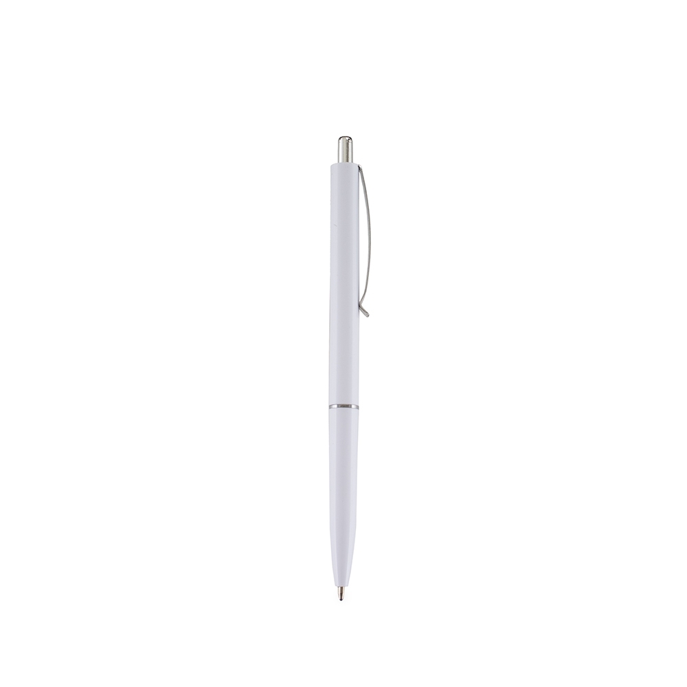 Caneta plástica com clip e ponteira em metal. Possui acionamento por clique e carga esferográfica azul de 1.0mm.