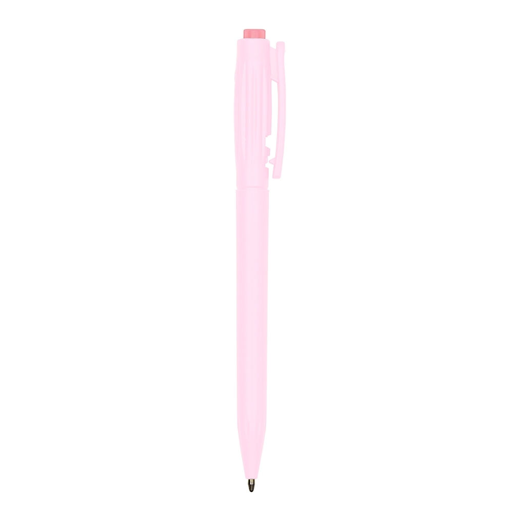 Caneta plástica com detalhes em relevo, acionamento em clique e destravamento ao pressionar a parte inferior do clip e carga esferográfica azul de 1.0mm, garantindo uma escrita precisa e pegada confortável.