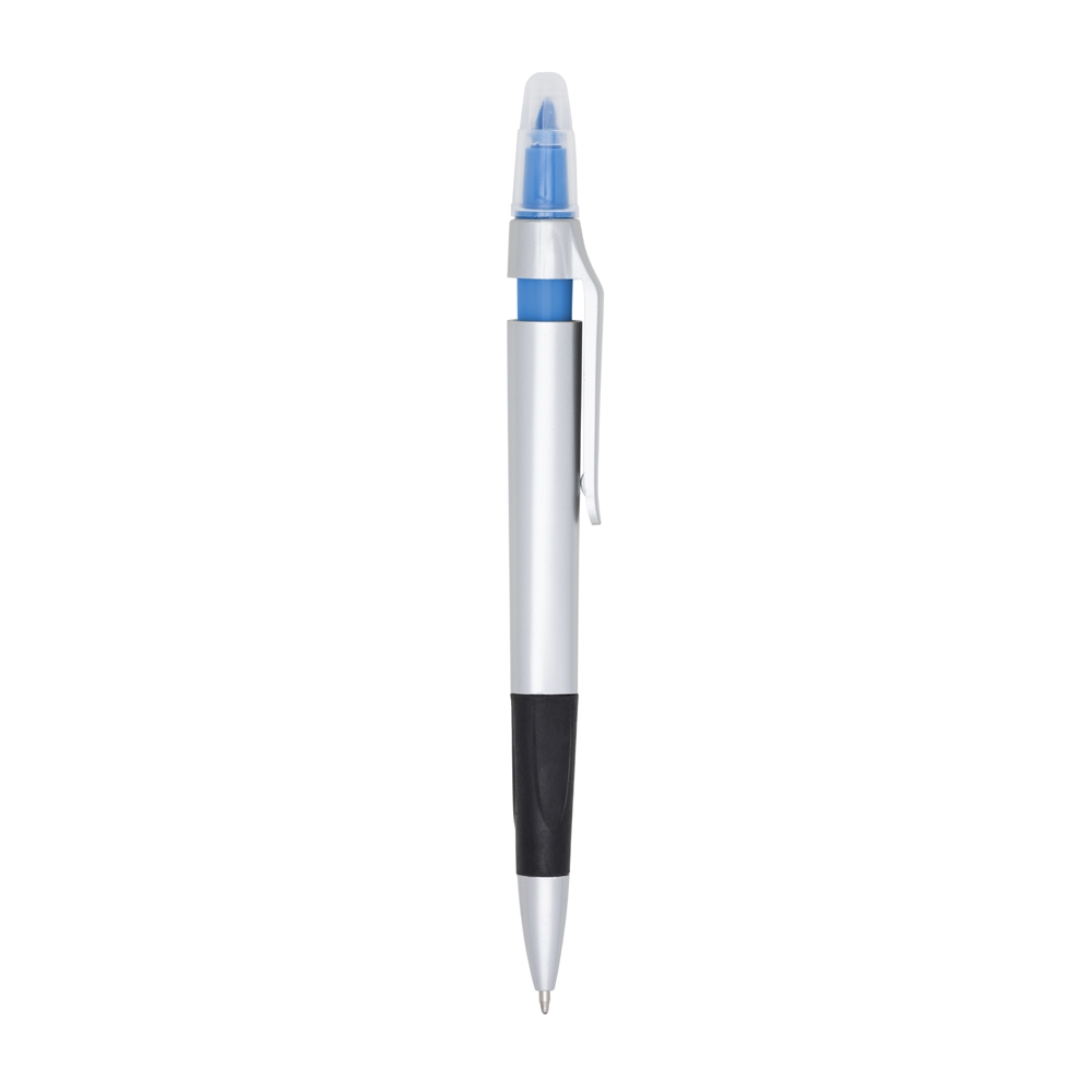 Caneta plástica com marca texto, contém detalhe emborrachado e tampa protetora para o marca texto. Carga esferográfica azul e acionamento por clique. OBS.: PEDIDOS MÍNIMO DE 50 PEÇAS!