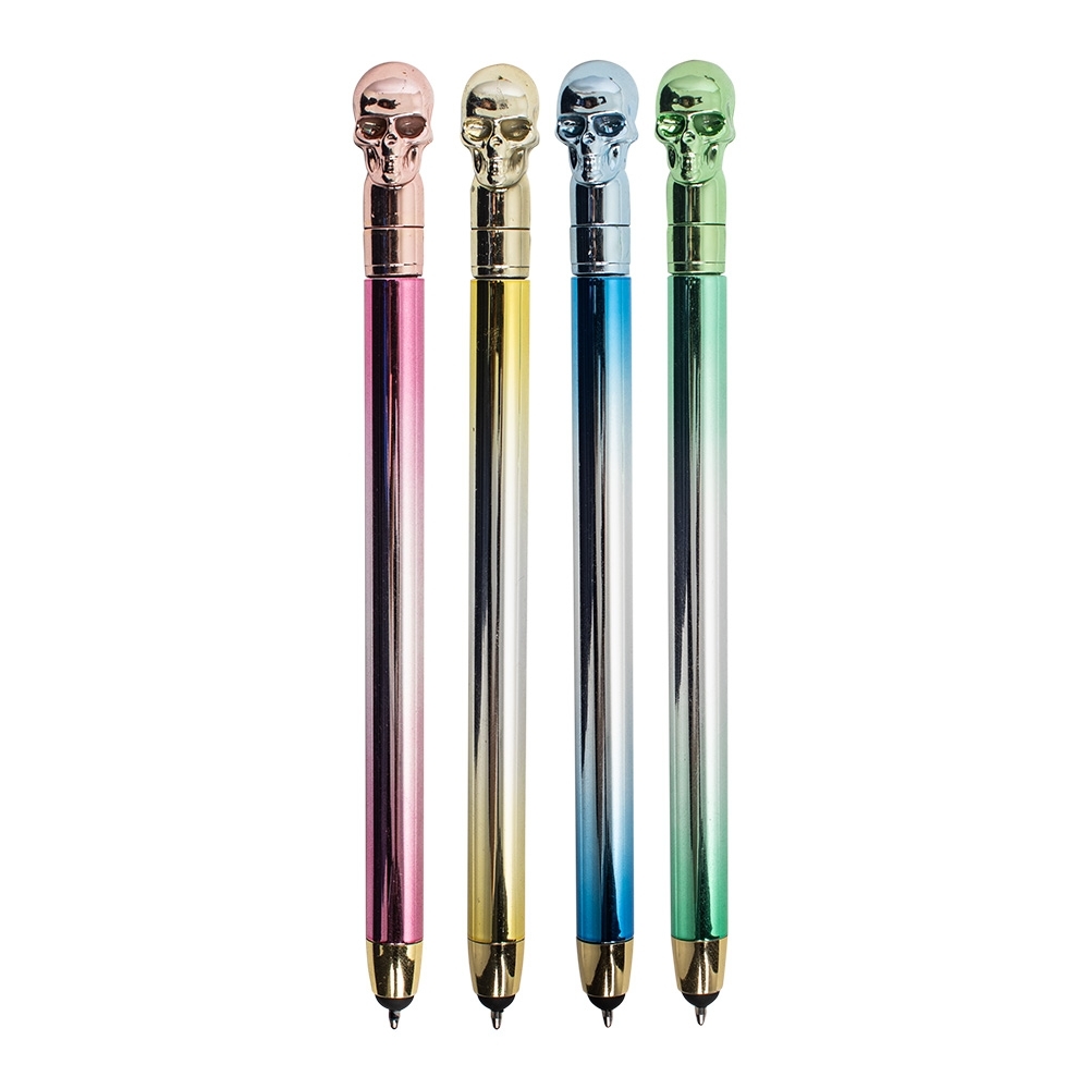 O toque de ousadia que o seu cotidiano precisava está nesta caneta estilizada, decorada com uma caveira em cores vibrantes. Feita de plástico, acionamento por rotação que oferece praticidade, enquanto a carga esferográfica azul de 1mm proporciona uma escrita suave e precisa. Além disso, conta com a funcionalidade touchscreen, permitindo navegação em dispositivos móveis com facilidade. Perfeita para quem busca um acessório único, que combina estilo e versatilidade! OBS.: PEDIDOS COM CORES SORTIDAS