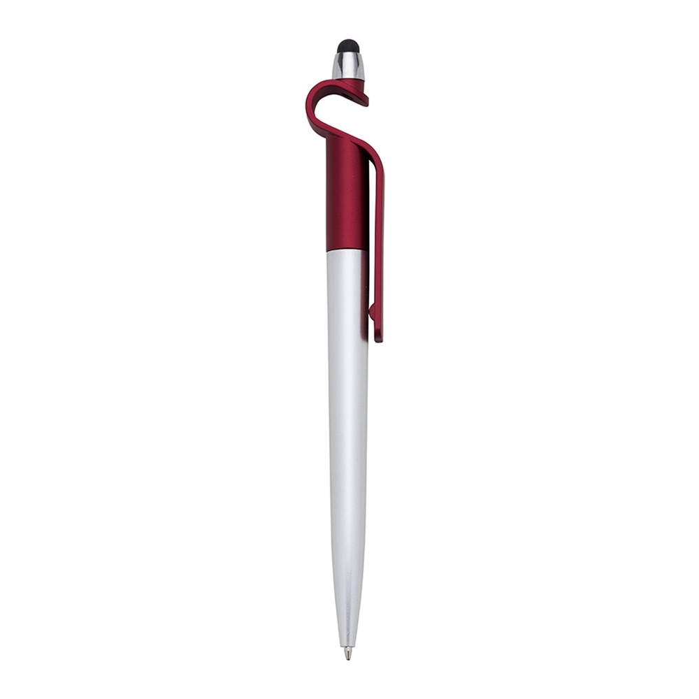 Caneta plástica com suporte para celular e touch screen. Carga esferográfica azul e acionamento por rotação. OBS.: PEDIDOS MÍNIMO DE 50 PEÇAS!