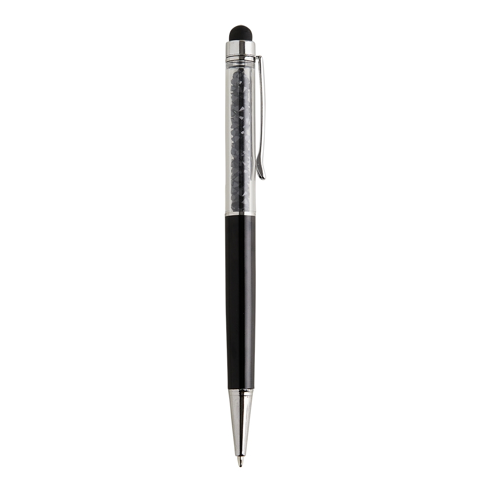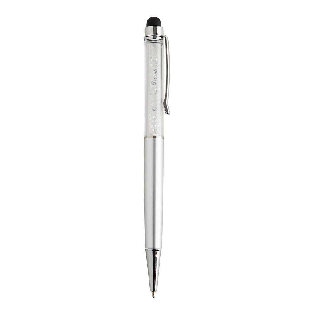 Caneta plástica com touch screen e detalhes em cristal, acionamento por rotação e carga esferográfica azul 1mm. OBS.: PEDIDOS MÍNIMO DE 50 PEÇAS!