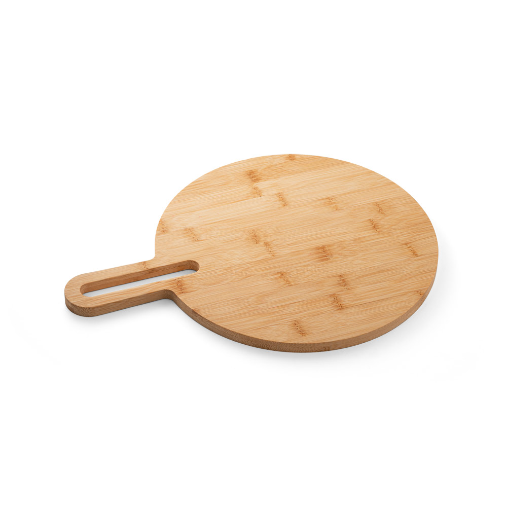 Tábua de servir em bambu com pega, de grande dimensão e de utilização versátil. Ideal para pizza. Fornecido em caixa presente de papel kraft reciclado. Certificação EU Food Grade. A cor e o resultado da impressão nos materiais naturais pode variar entre produtos. 408 x 310 x 12 mm