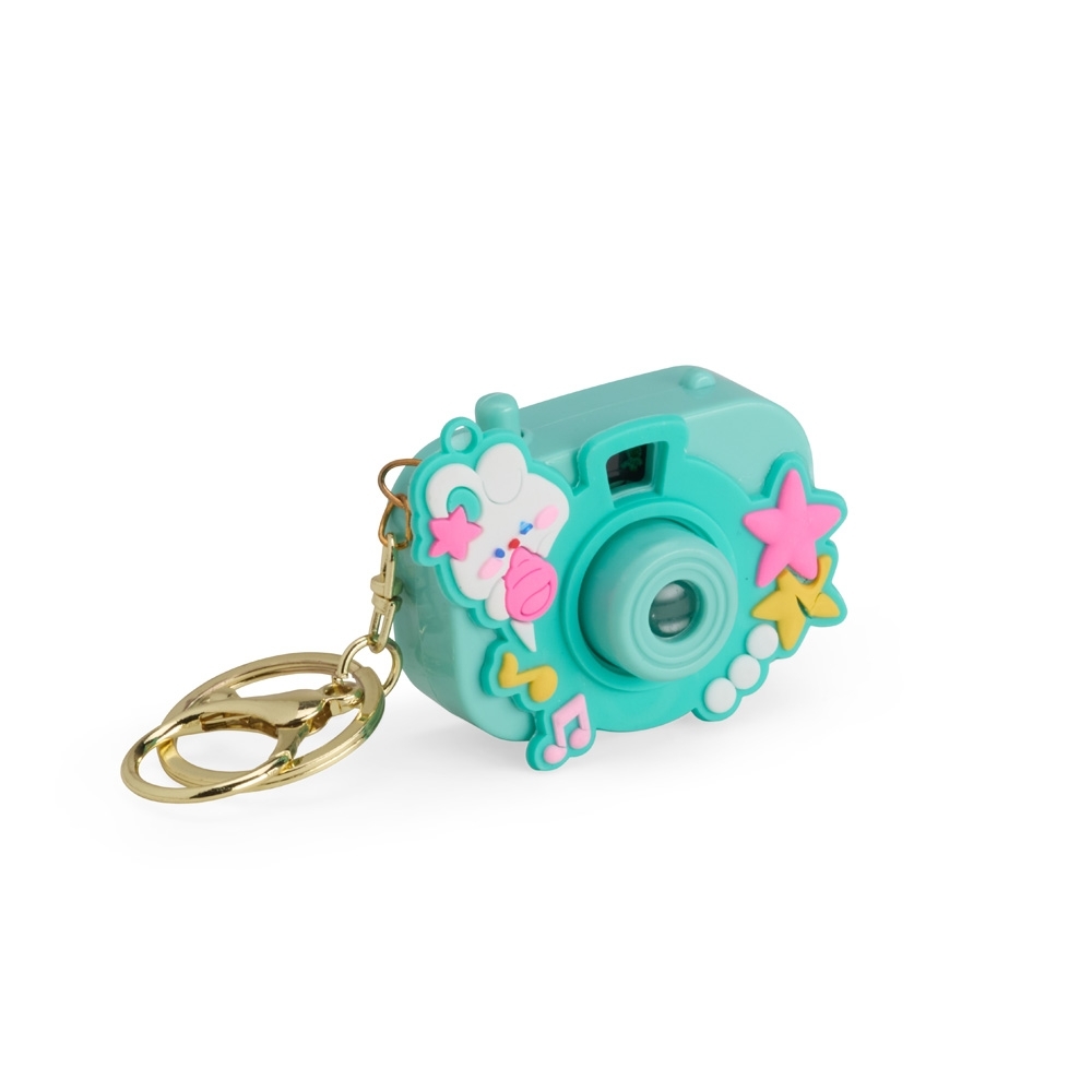 Chaveiro em plástico no formato de câmera, com detalhes decorativos de animais. Possui projeção de oito figuras de animais, acionada por botão, além de argola e mosquetão em metal. Acompanha três baterias L736 já embutidas.