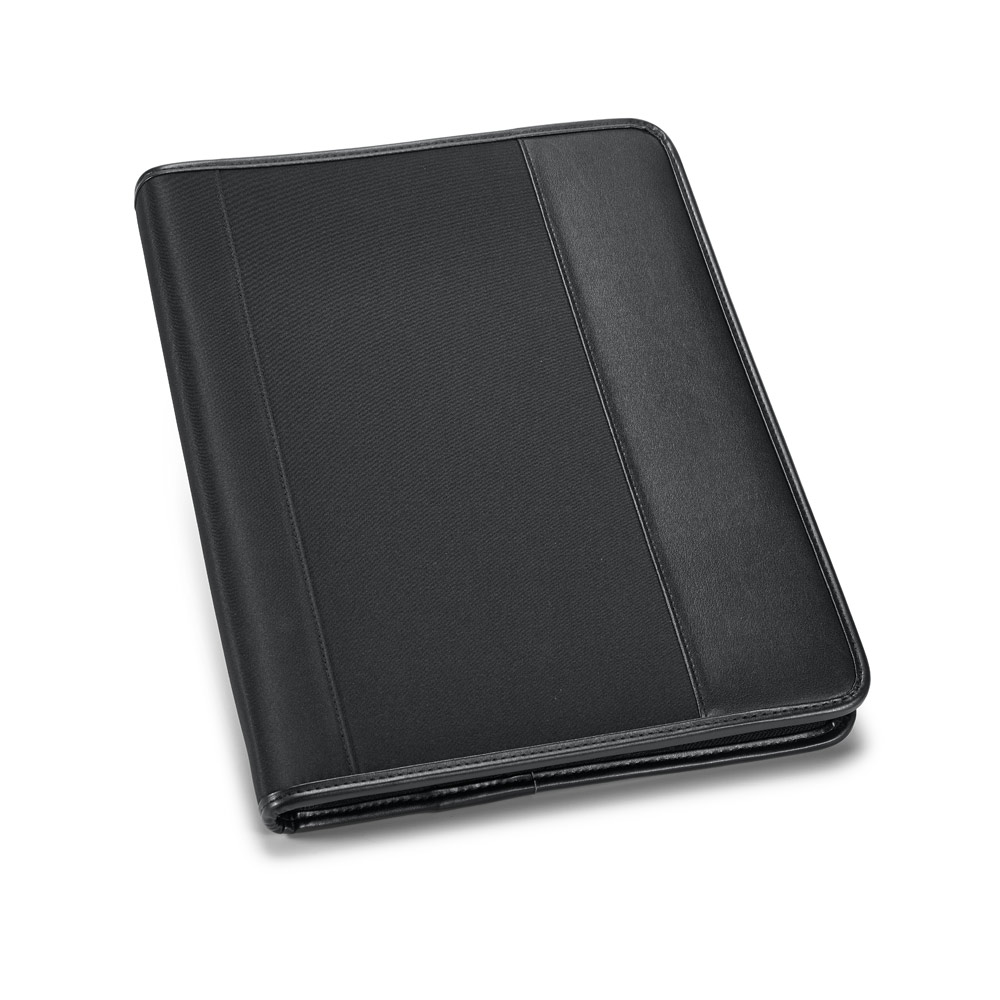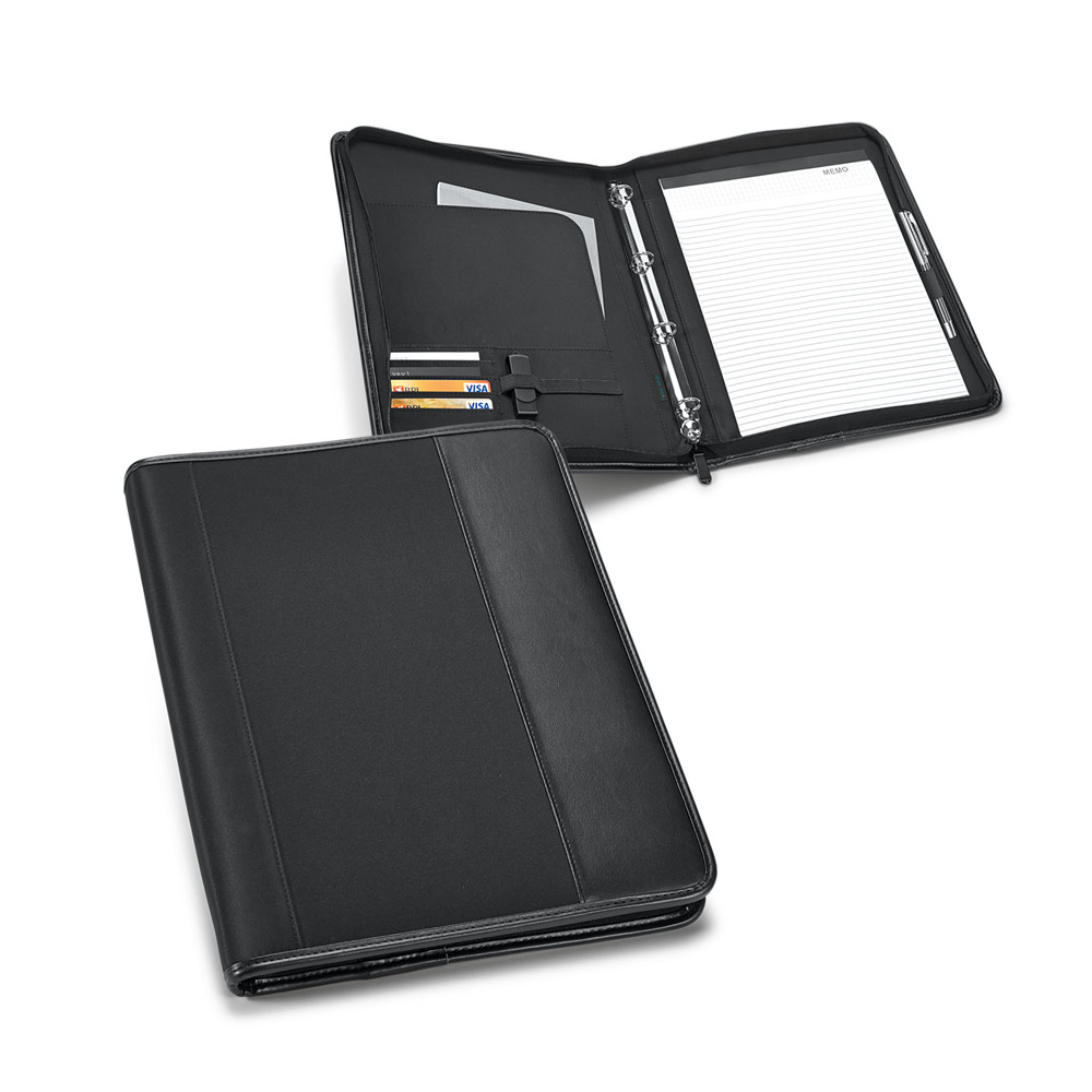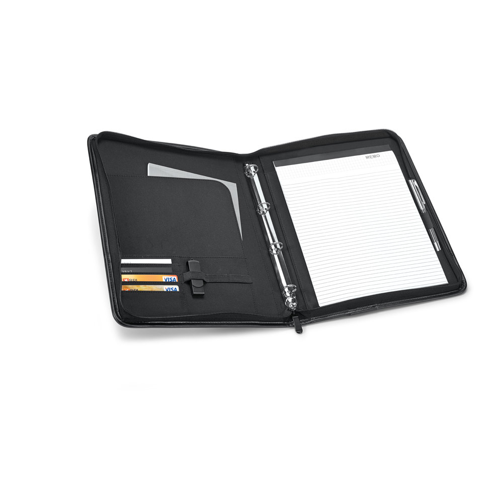 Pasta A4 em c. sintético e microfibra com 4 argolas de 20mm. O interior contém um bloco de 40 páginas pautadas, suporte para esferográfica (não inclusa) e vários bolsos. Pen drive não inclusa. 265 x 340 x 45 mm
