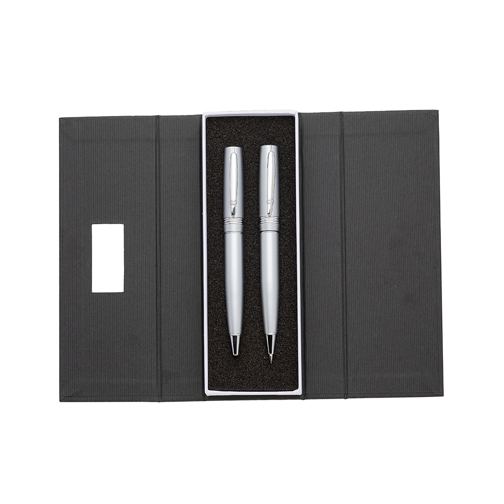 Conjunto caneta e lapiseira em estojo de cartonagem com placa central para personalização. Caneta/Lapiseira metal inteira colorida com detalhes prata, clip metal com duas ?linhas? e na ?ponta? superior detalhe de uma linha no meio. Possui três anéis abaixo do clip, anel centralizado e anel inferior e acionam por giro. Estojo revestida com espuma na parte interna.