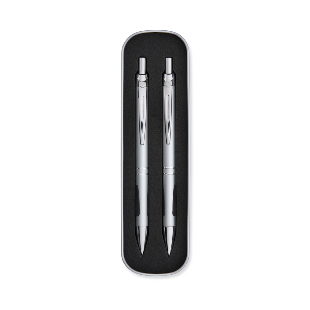 Conjunto de caneta e lapiseira metálicas em estojo de metal. Caneta e lapiseira possuem acabamento fosco, detalhe emborrachado na parte inferior, carga esferográfica azul de 1.0mm e acionamento por clique. Estojo revestido em espuma.