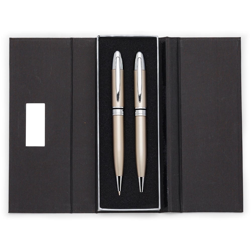 Conjunto caneta e lapiseira em estojo de cartonagem com placa central para personalização. Clip metal e anel central possui: anel fino prata, anel preto fino e um anel maior prata com relevo e acionam por giro. Estojo revestido com espuma na parte interna.