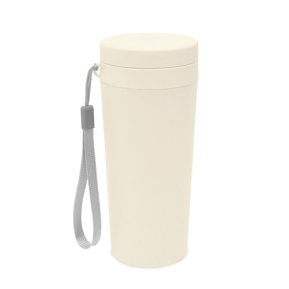 Copo isotérmico fibra de bambu 350ml com parede dupla e alça. Copo produzido em Polipropileno livre de BPA, possui uma tampa de vedação rosqueável e alça de nylon (removível) para transporte. Conserva a temperatura interna durante um período de 1 à 2 horas, mas não dispõe de isolamento térmico. O copo pode ser levado a lava-louças, geladeira e micro-ondas.