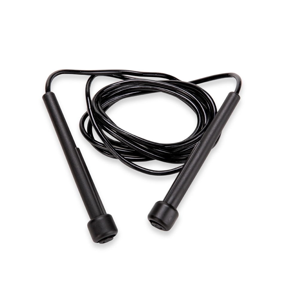 Corda de pular em PVC. Possui cabos em policloreto (PP) com estrutura que permite o ajuste do comprimento, podendo atingir extensão máxima de aproximadamente 2,5 metros.