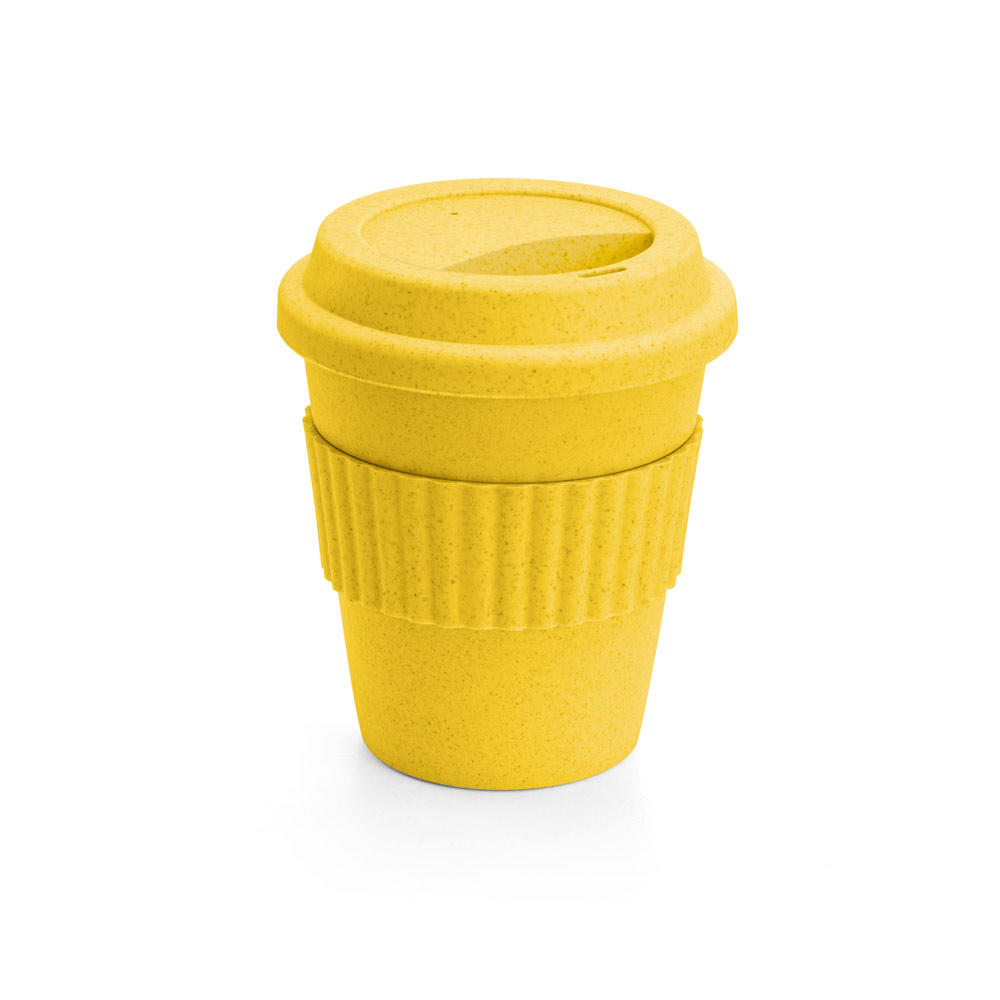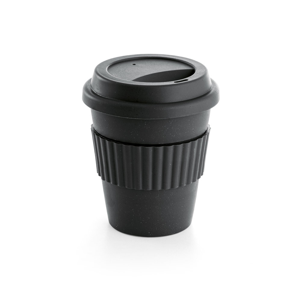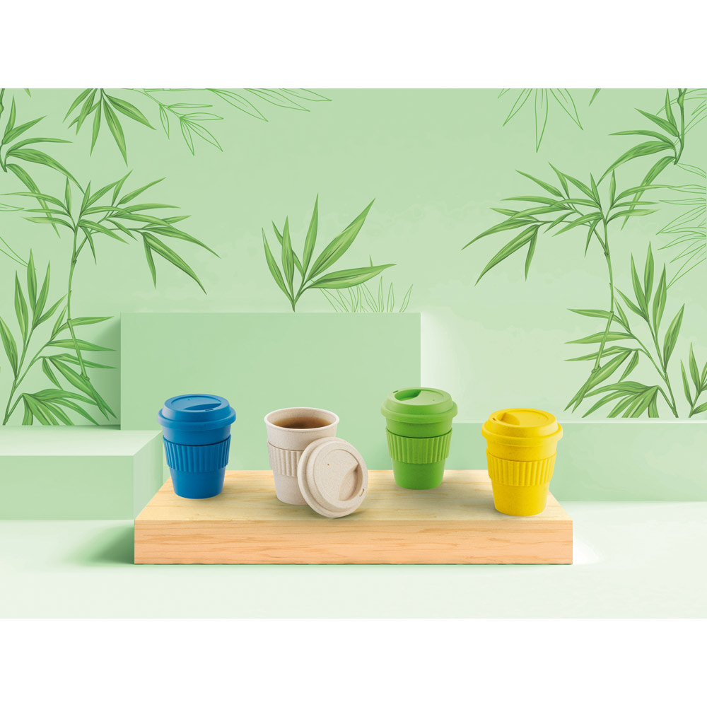 Copo de viagem em fibra de bambu (60%) e PP (40%), com tampa. Tira em silicone para facilitar o transporte de bebidas quentes. Capacidade até 380 mL. Certificação EU Food Grade. ø95 x 114 mm