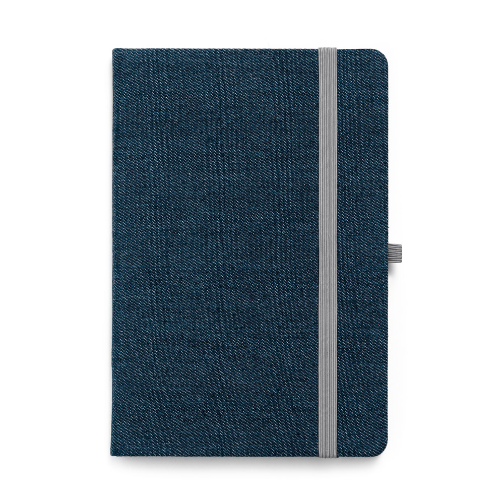 Caderno A5 de capa dura forrada em tecido tipo jeans, com 160 páginas pautadas, elástico, fita separadora, bolso interior e suporte para esferográfica (não inclusa). 140 x 210 mm