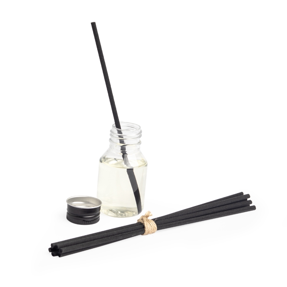 Difusor de aromas 60ml com essência de cedro verde. Frasco plástico, acompanham 6 varetas de fibra.