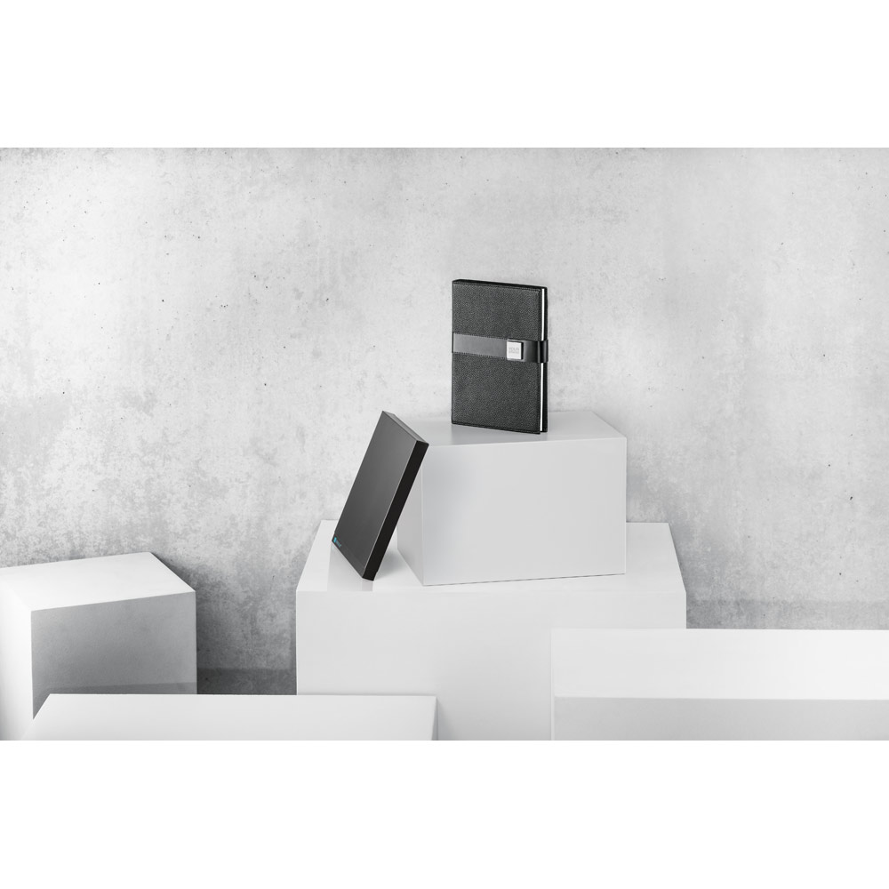 O EMPIRE é, um caderno A5 de design moderno, minimalista e com toque business. A capa dura em couro protege o seu interior que, de forma inteligente, se divide em três partes distintas com um separador que permite identificar cada uma das partes. As suas 120 folhas em papel proveniente de gestão florestal sustentável, dividem-se proporcionalmente por folhas não pautadas, pautadas e pontilhadas. O seu design minimalista é, complementado pelo detalhe metálico no fecho, característico desta linha de produtos e que reforça a sua elegância. Produto fornecido com suporte de esferográfica (não inclusa). Fornecido em caixa presente. 150 x 210 mm | Caixa: 197 x 28 x 262 mm