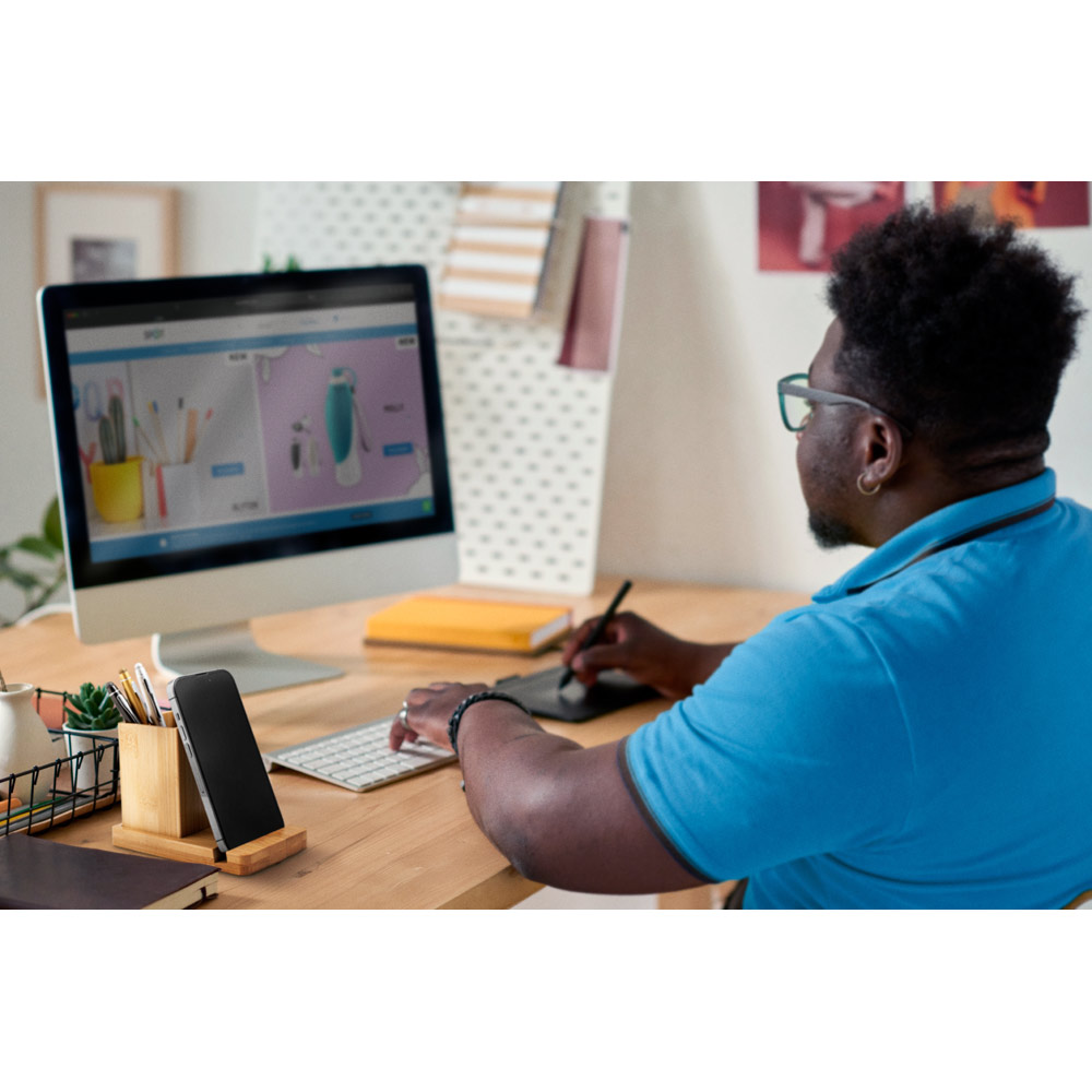 Conjunto de mesa em bambu, ideal para organizar o seu espaço de trabalho. Composto por 1 canaleta para suporte do seu celular e um copo, desmontável, para organizar as suas esferográficas e outros materiais de trabalho. Fornecido em caixa presente de papel kraft reciclado. A cor e o resultado da impressão nos materiais naturais pode variar entre produtos. Dimensões montado: 80 x 145 x 104 mm | Caixa: 80 x 145 x 33 mm