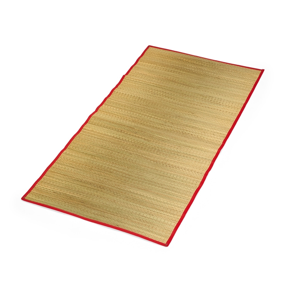 Esteira leve feita em palha natural com bordas costuradas em nylon. Acompanha saco de nylon com seção telada, cordão de fechamento e alça regulável para transporte.