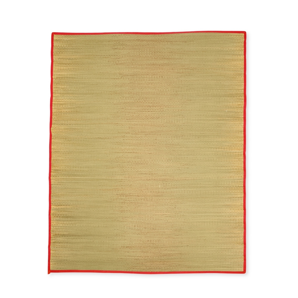 Esteira leve em palha natural com bordas costuradas em nylon. Acompanha saco de nylon com seção telada, cordão de fechamento e alça regulável para transporte.