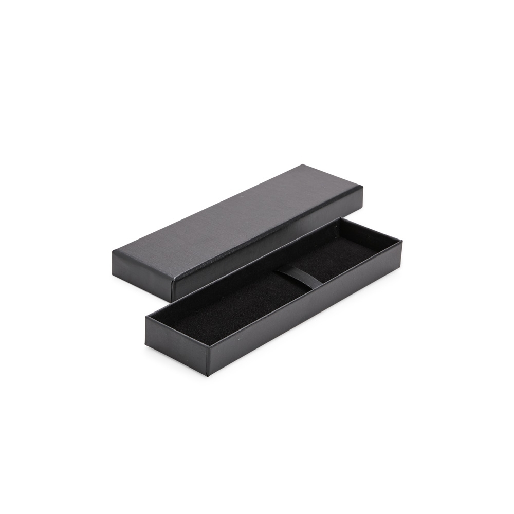 Estojo feito em papelão com interior aveludado e fita de cetim ideal para fixar uma caneta.