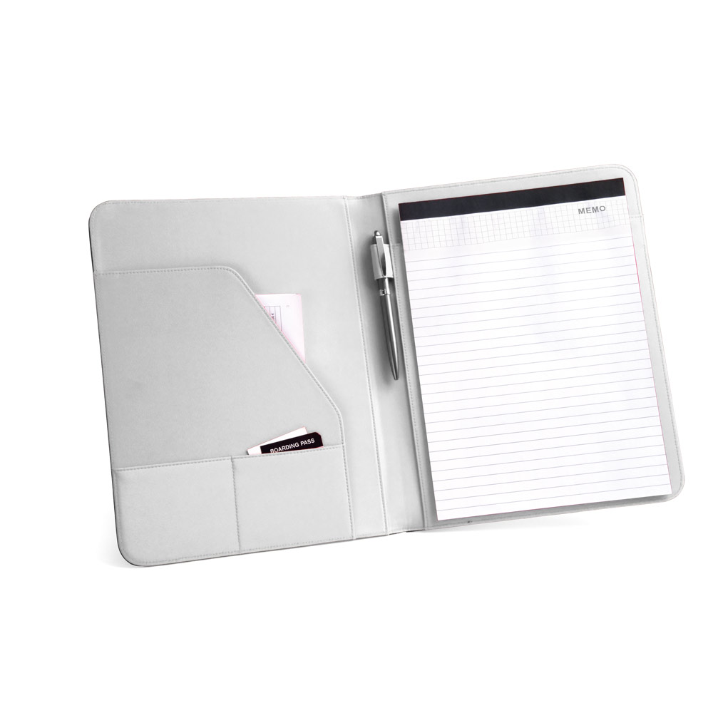 Pasta A4 em c. sintético e 800D com o interior em microfibra e elástico para fechar. O interior contém um bloco de 40 páginas pautadas, suporte para esferográfica (não inclusa) e vários bolsos. 245 x 315 x 15 mm