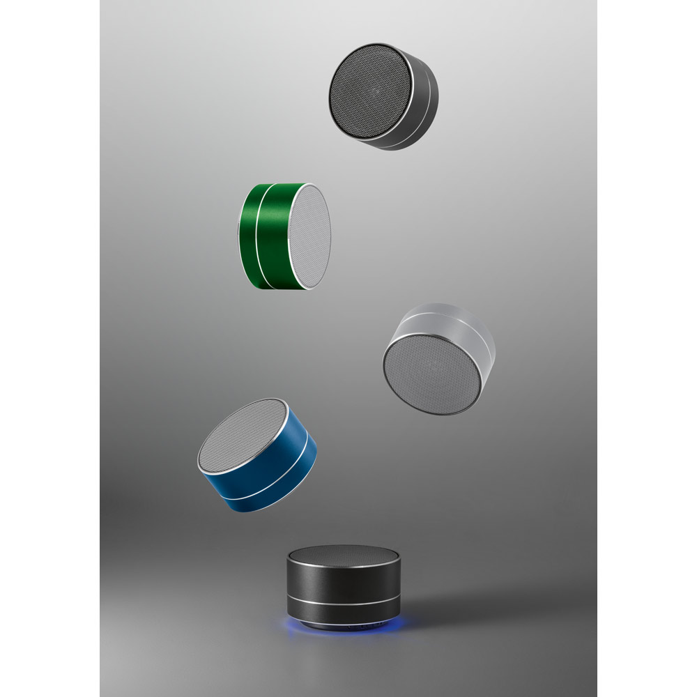 Caixa de som portátil com microfone, em alumínio 100% reciclado e detalhes em ABS 100% reciclado. Transmissão sem fios BT v5’0 e leitor de cartões microSD com 3W. Bateria com 400 mAh e autonomia aproximada de 3h. Função para atender chamadas, controle de volume e conexão à playlist do dispositivo móvel. Incluso cabo USB para carregar. Fornecido em caixa presente de papel kraft reciclado. ø71 x 42 mm | Caixa: 80 x 80 x 60 mm