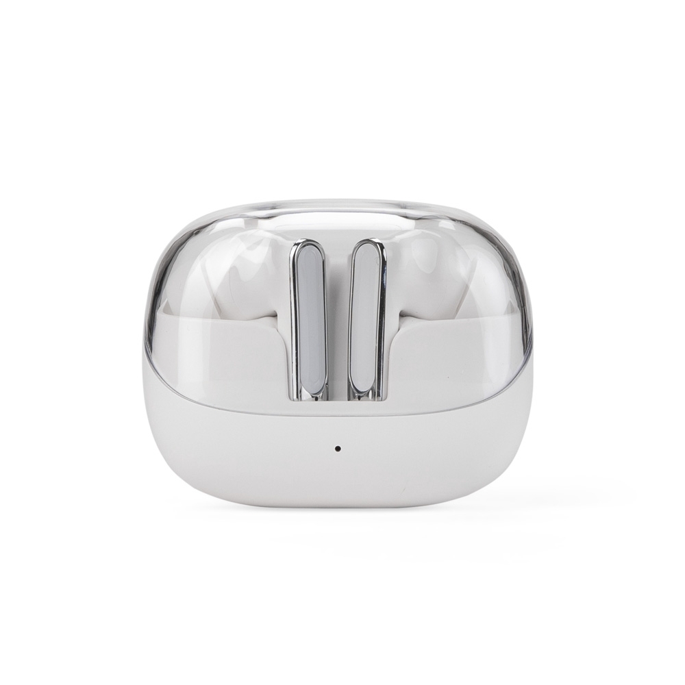 Fones de ouvido sem fio com estrutura em plástico resistente a leves respingos de água. Apresenta conexão Bluetooth 5.4 e responde a comandos por toque, além de estojo para carregamento em plástico texturizado com entrada USB-C. Acompanha cordão em nylon com clipe plástico e cabo USB-C para recarga dos fones.