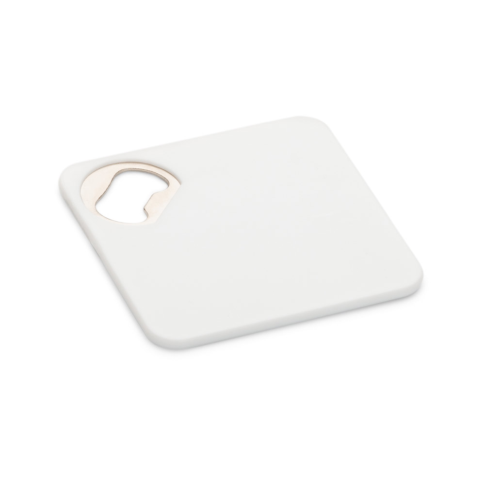 Porta copos em ABS com abridor de garrafas e esponja antiderrapante na base. 82 x 82 x 4 mm