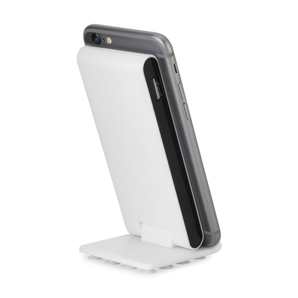 Bateria portátil em ABS com ventosas na base. Bateria de lítio com capacidade de 4’000 mAh, tempo de vida ≥ 500 ciclos e com entrada/saída 5V/1A. Incluso cabo USB / micro USB para carregar a bateria. Bateria: 123 x 50 x 14 mm | Base: 65 x 58 x 10 mm