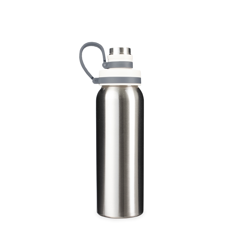 Garrafa em inox com capacidade máxima de 800ml. Possui tampa plástica com protetor rosqueável para o bocal e alça fixa em silicone.