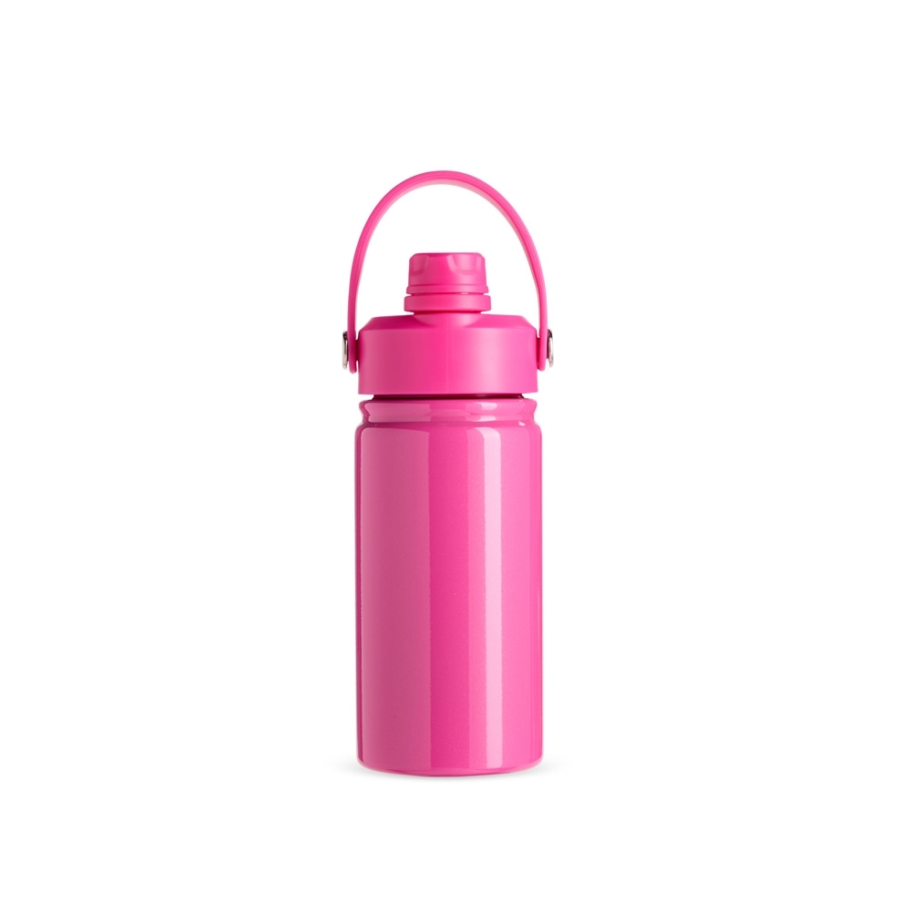 Garrafa térmica em inox com capacidade máxima para 400ml. Apresenta estrutura de parede dupla com vedação a vácuo, garantindo a conservação da temperatura de líquidos por mais tempo. Possui tampa plástica rosqueável com protetor para o bocal, bico flip, canudo interno removível e alça fixa para transporte.