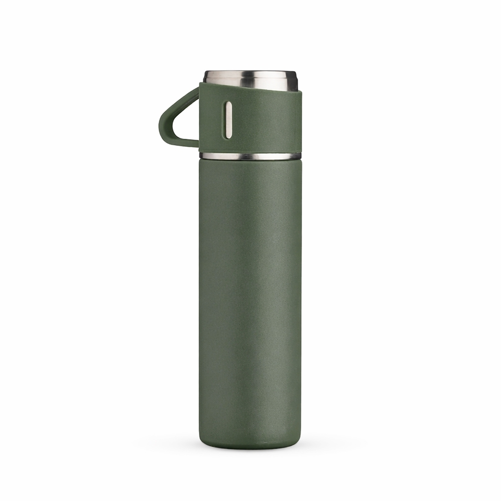 Garrafa térmica 450ml em inox com tampa que pode ser utilizada como caneca, tampa interna em plástico resistente (basta um clique para abrir ou fechar), base com borracha antiderrapante.