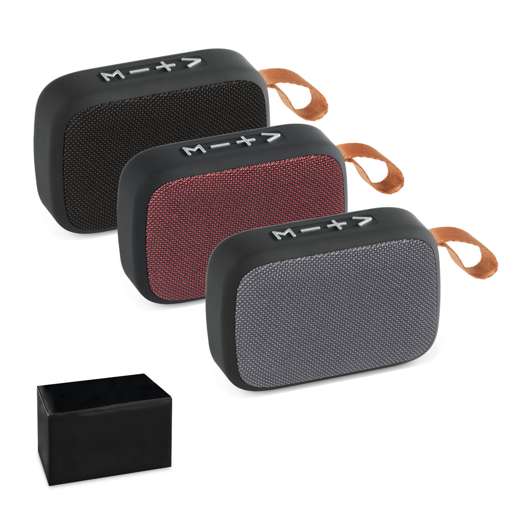 Caixa de som portátil com microfone, em ABS, tecido em poliéster e acabamento emborrachado. Possui transmissão sem fios BT v5’0, ligação stereo 3.5 mm e leitor de cartões microSD. Potência de 3W/4Ω, bateria com capacidade de 300 mAh e autonomia, aproximada, de 2h. Função para atender chamadas, controle de volume, conexão à playlist do dispositivo móvel e rádio FM. Incluso cabo USB-C para carregar. Fornecida em caixa presente. 120 x 80 x 40 mm | Caixa: 142 x 85 x 45 mm