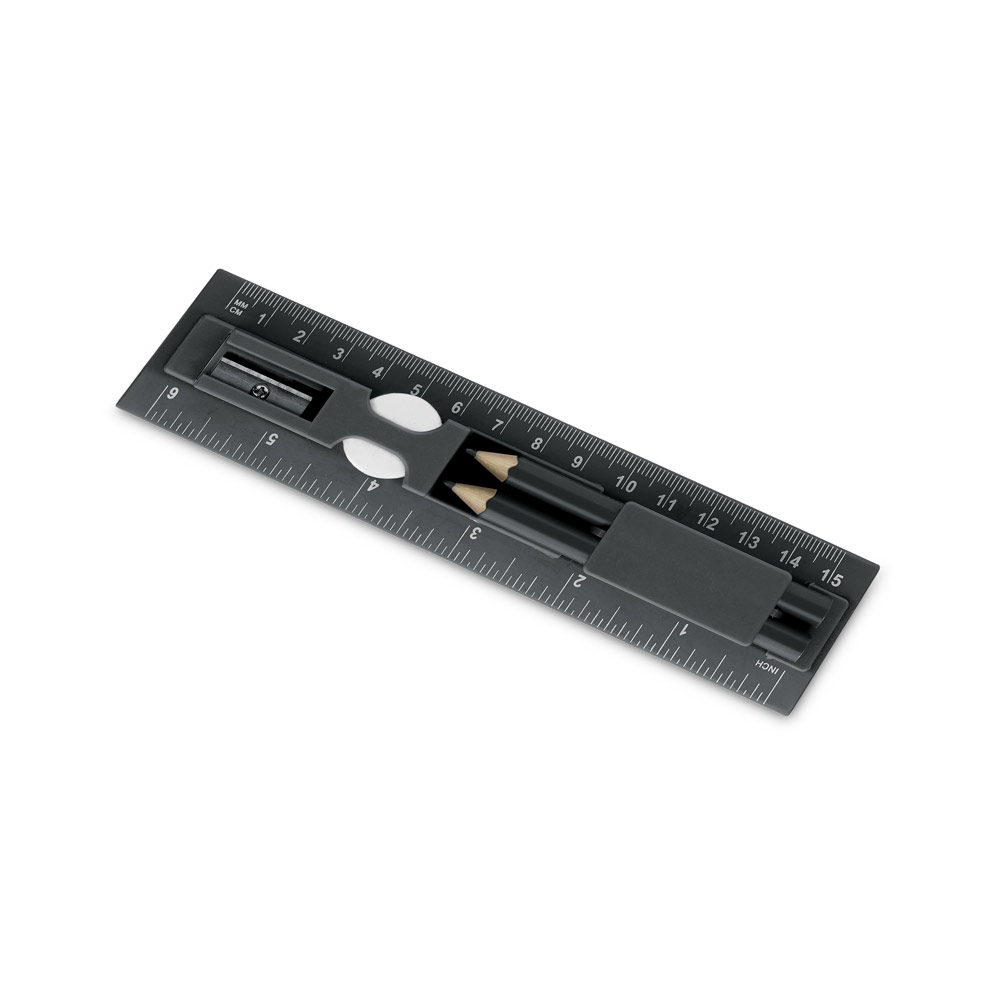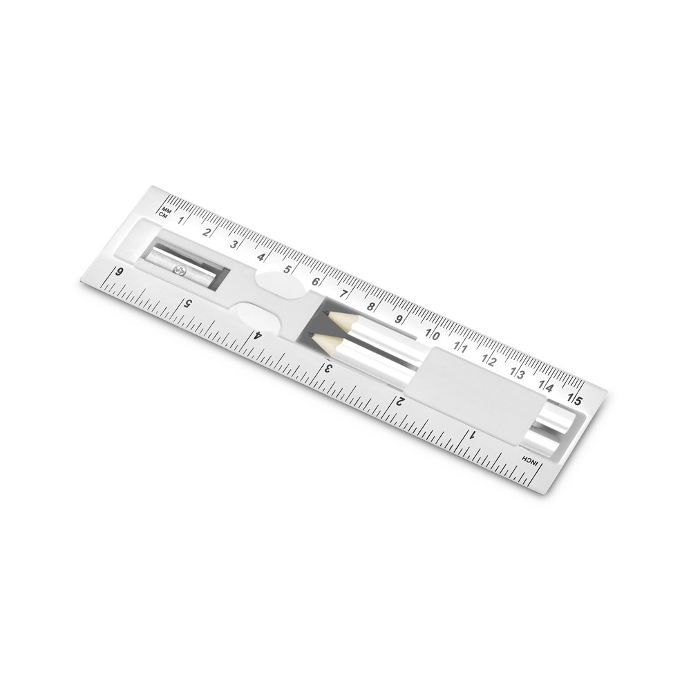 Kit de escrita em PS. Incluso régua de 15 cm, 2 mini lápis, 1 borracha e 1 apontador. Produto certificado de acordo com a portaria Inmetro nº423 de 8/out/2021. Régua: 157 x 42 x 15 mm