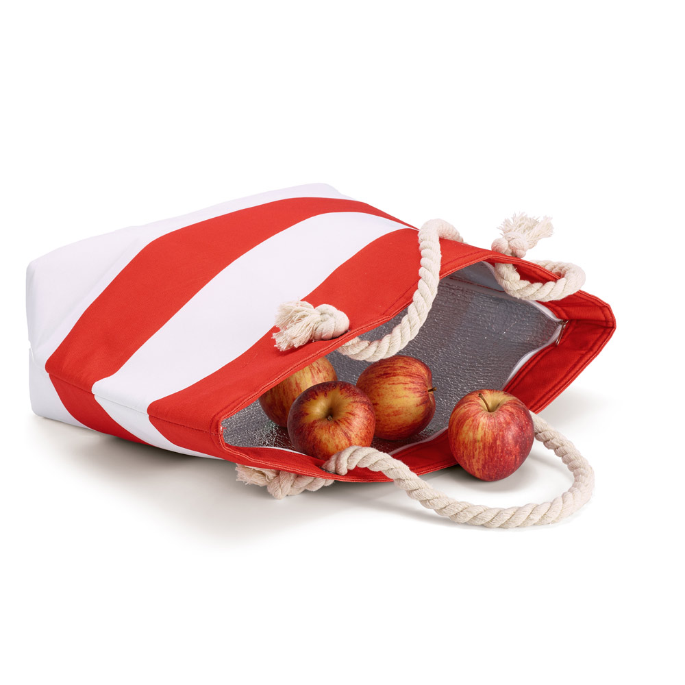 Sacola térmica em poliéster reciclado 600D e alça em algodão com 65 cm. Contém um bolso principal com isolamento e 1 bolso frontal. Capacidade até 16 L. Certificação EU Food Grade. 500 x 360 x 145 mm