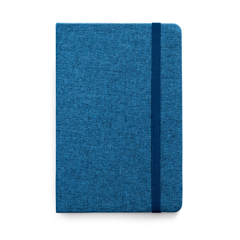 Caderno A5 com capa dura forrada em tecido poliéster e 160 páginas pautadas em cor marfim. Contém elástico e fita separadora. 137 x 210 mm