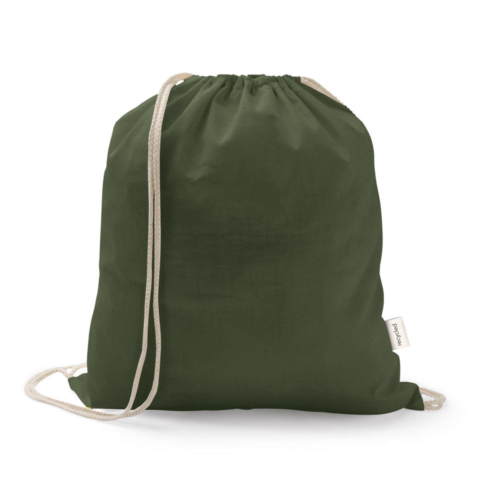 Sacola tipo mochila em 70% algodão reciclado e 30% poliéster reciclado (150 g/m²), com alças de algodão. O tecido é sem tingimento, e utilizado na sua cor original, sem produtos químicos de tingimento ou branqueamento, contribuindo para um menor impacto ambiental. 370 x 410 mm