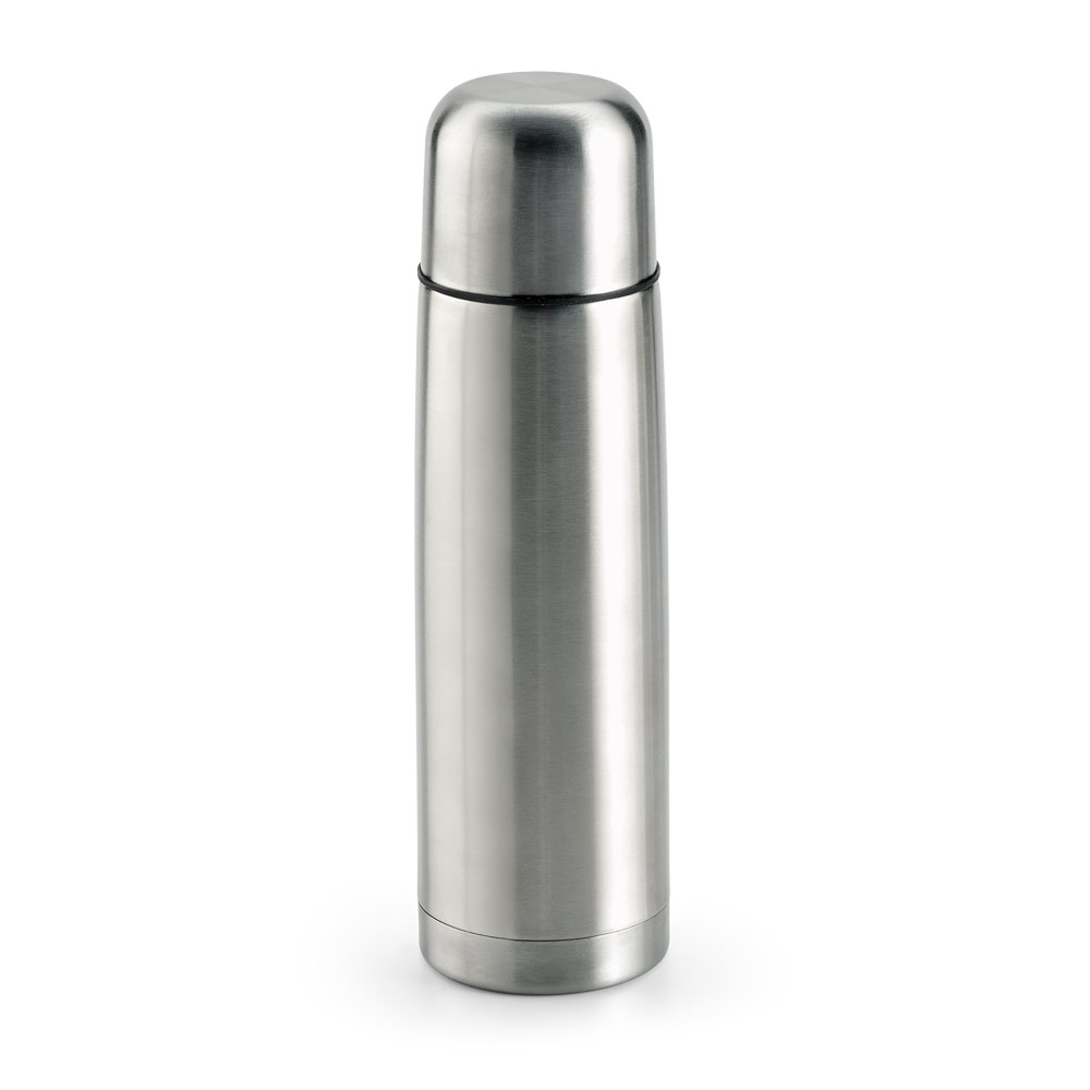 Garrafa em aço inox de parede dupla térmica, isolada a vácuo. A tampa interior possui sistema de botão abre e fecha dando maior isolamento e segurança contra vazamentos. O design da tampa vira um copo para que possa consumir a sua bebida preferida. Capacidade até 500 mL. Fornecida em caixa presente. Certificação EU Food Grade. ø69 x 240 mm