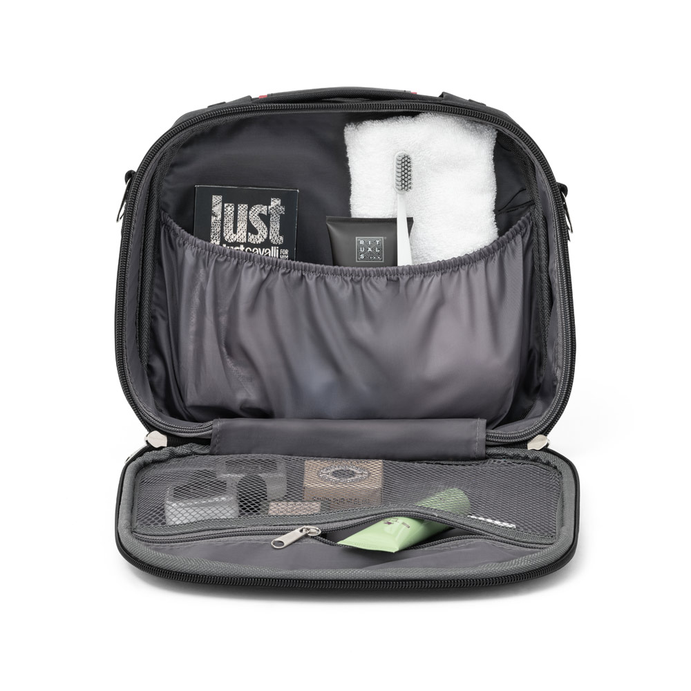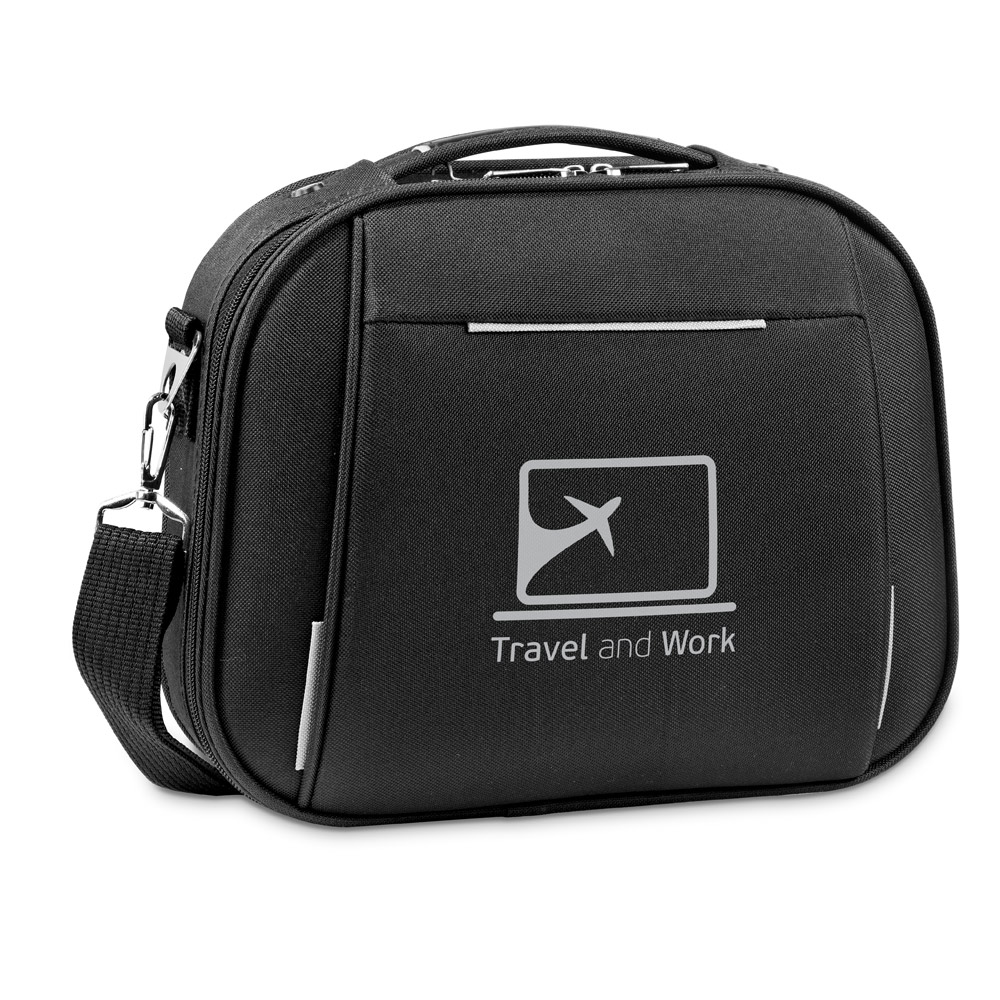 Mala de cosméticos em 600D e EVA com fecho duplo. Compartimento frontal semi-rígido e interior forrado com 2 bolsos. A mala tem uma banda para transporte em trolley de viagem e alça ajustável em webbing. 305 x 250 x 85 mm