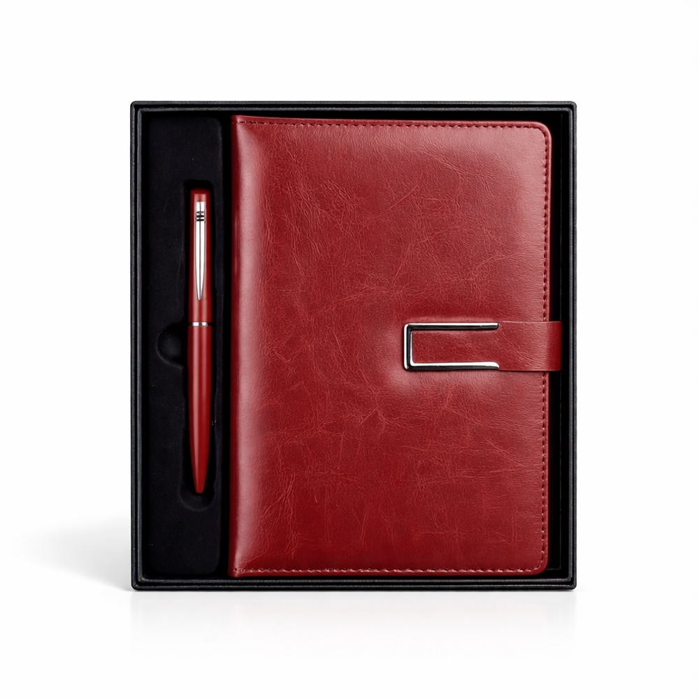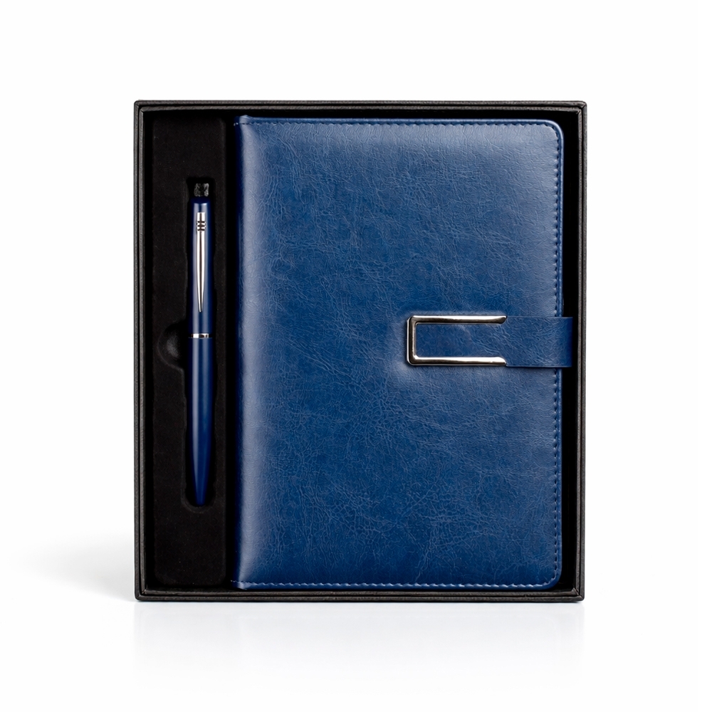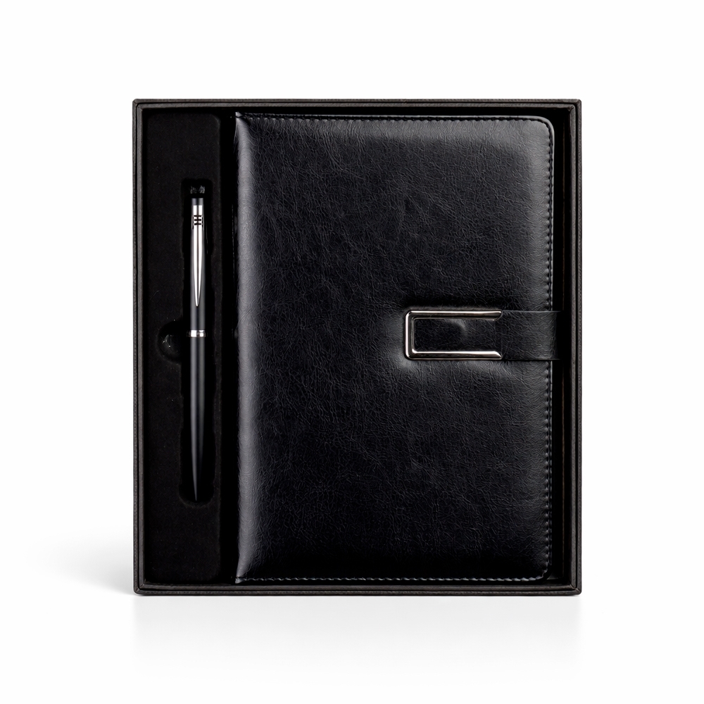 Kit executivo composto por dois itens: uma caderneta e uma caneta. A caderneta possui capa em couro sintético, fecho magnético com detalhe metálico na aba, marca-páginas em fita de cetim e cerca de 96 folhas marfim pautadas e espaço para assinalar dias da semana e datas numéricas. A caneta metálica conta com acionamento por rotação e carga esferográfica azul de 1,0mm. Acompanha caixa em papelão com berço em plástico para guardar os itens do conjunto.