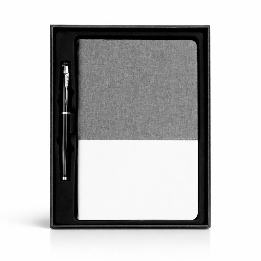 Kit executivo composto por dois itens: uma caderneta e uma caneta. A caderneta possui capa em PU, fecho em elástico, marca-páginas em fita de cetim e cerca de 80 folhas marfim pautadas. A caneta metálica possui ponta em plástico ABS e carga esferográfica preta de 0,8 mm. Acompanha caixa em papelão com berço em PET com revestimento aveludado para acomodação dos itens.