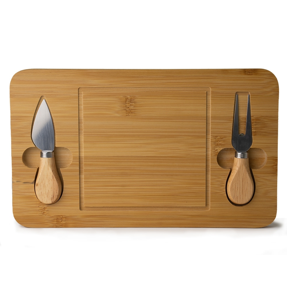 Kit queijo 3 peças, contém: tábua de bambu canaleta, faca com ponta, garfo e espátula. Tábua com imã para encaixe e fixação dos utensílios.
