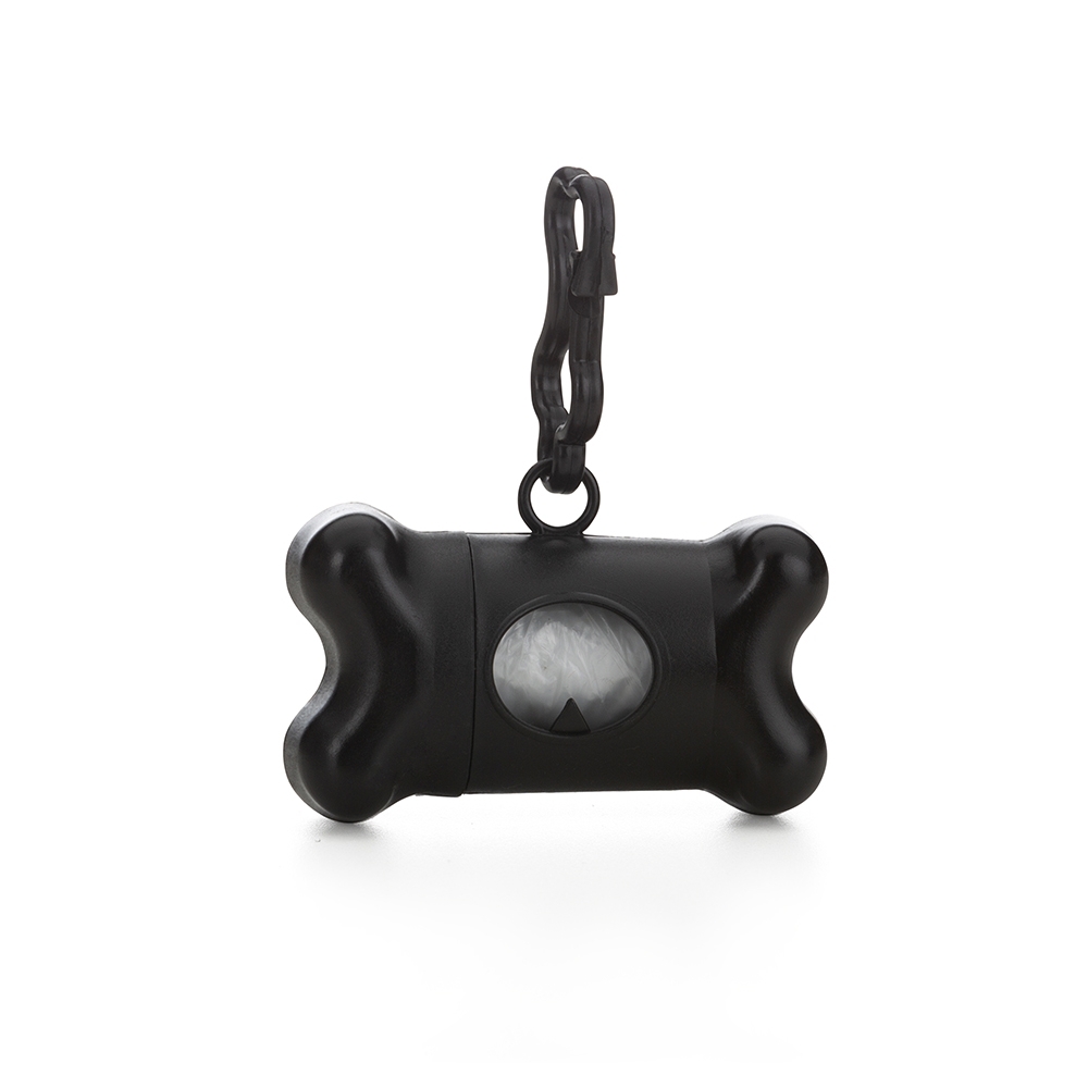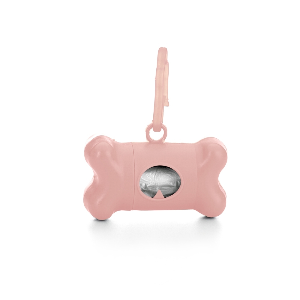 Kit saquinho coletor em formato de osso. Produzido em material plástico, o kit possui abertura lateral para encaixe do rolo e parte frontal vazada com dente plástico, permitindo puxar e destacar os saquinhos. Acompanha mosquetão e rolo de saquinhos.