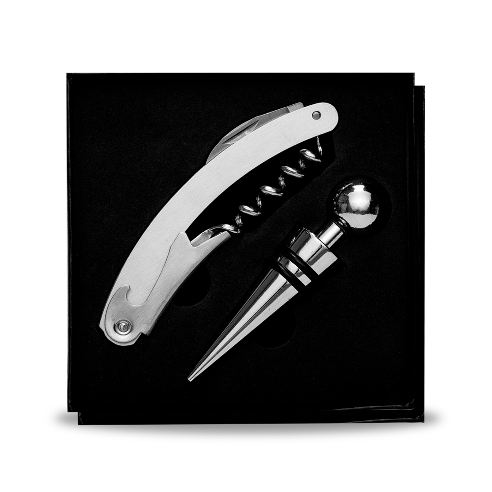 Kit vinho 2 peças em estojo com tampa, contém saca-rolhas metálico com lâmina de corte e abridor de garrafa e tampa de bico. Área interna do estojo com berço de espuma. Acompanha plaquinha metálica para personalização.