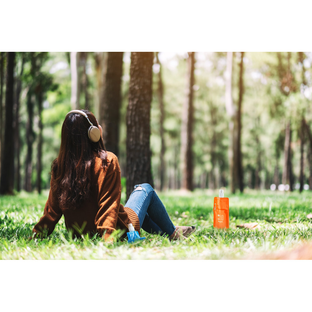 Squeeze dobrável em PE com bico de sistema “push-pull” e acabamento translúcido com mosquetão para fácil transporte. Capacidade até 460 mL. Certificação EU Food Grade. 120 x 260 x 30 mm
