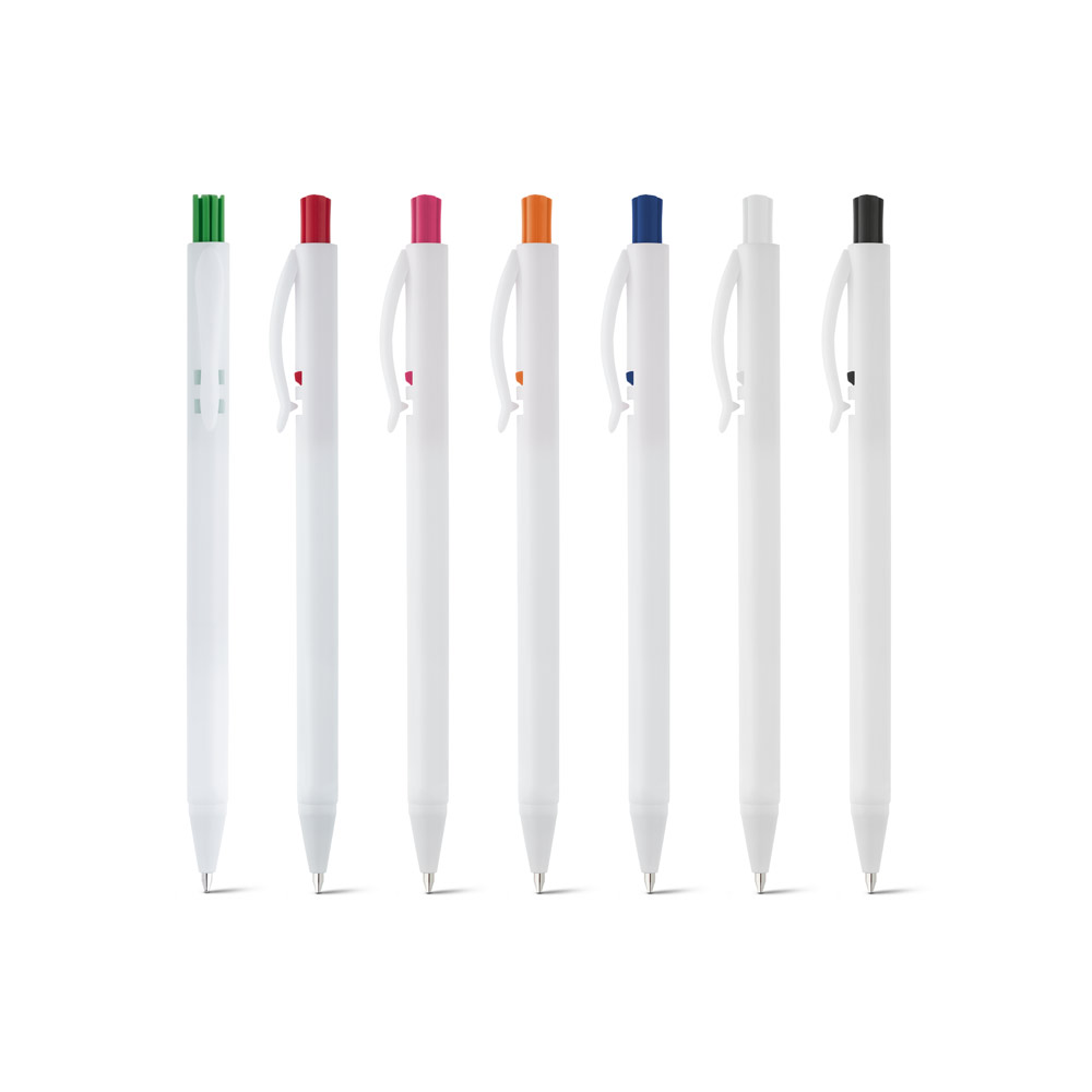 Esferográfica em ABS com acabamento brilhante e mecanismo colorido. Escrita em azul até 1.5 km. Produto certificado de acordo com a portaria Inmetro nº423 de 8/out/2021. ø9 x 141 mm