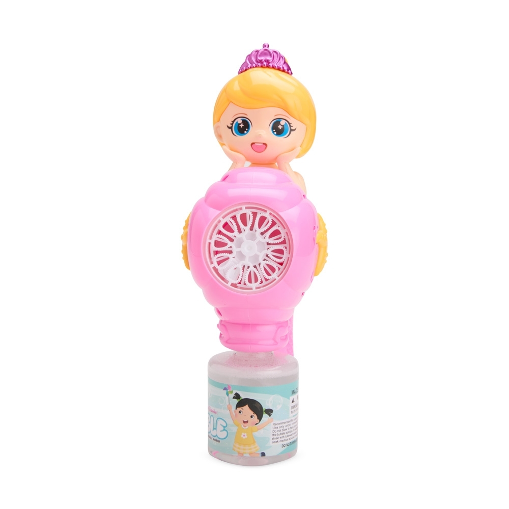Brinquedo lançador de bolhas de sabão feito em plástico com o formato de sereia. Ao acionar o gatilho, acende luzes de LED e dispara múltiplas bolhas. Funciona com quatro pilhas AA (não inclusas) e acompanha um frasco líquido para bolhas.