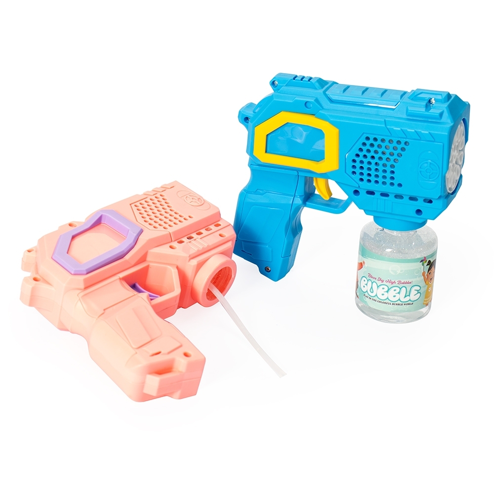 Brinquedo lançador de bolhas de sabão feito em plástico. Ao acionar o gatilho, dispara múltiplas bolhas de uma só vez. Funciona com quatro pilhas AA (não inclusas) e acompanha frasco com líquido para formar bolhas e adesivos para decoração.