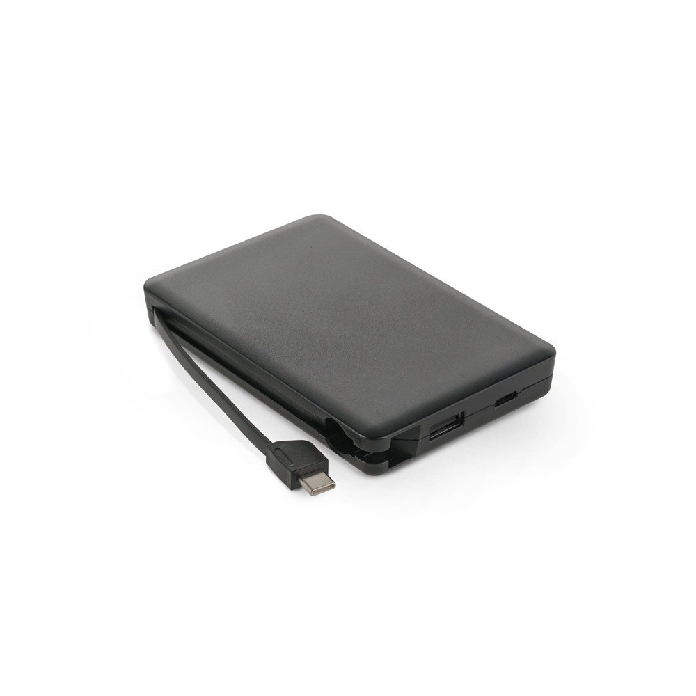 Bateria portátil em ABS 100% reciclado, com cabo integrado. Bateria portátil com capacidade de 10’000 mAh, indicador de nível de carga, uma porta de entrada e saída USB-C, uma porta de saída USB-A e um cabo USB-C integrado, de entrada e saída, para maior comodidade, permitindo carregar de forma prática quer a própria bateria portátil, quer os seus dispositivos móveis. A bateria permite carregar dois dispositivos em simultâneo. Fornecida em caixa presente de papel kraft reciclado. 113 x 73 x 16 mm | Caixa: 75 x 115 x 18 mm